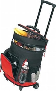 Foam padded cooler with removable liner, Top sandwich compartment, Zippered front doc. inside mesh pocket, Outside cell pocket, bottle holder and mesh doc. Locking Pull-up handle, Two rubber roller skate wheels.